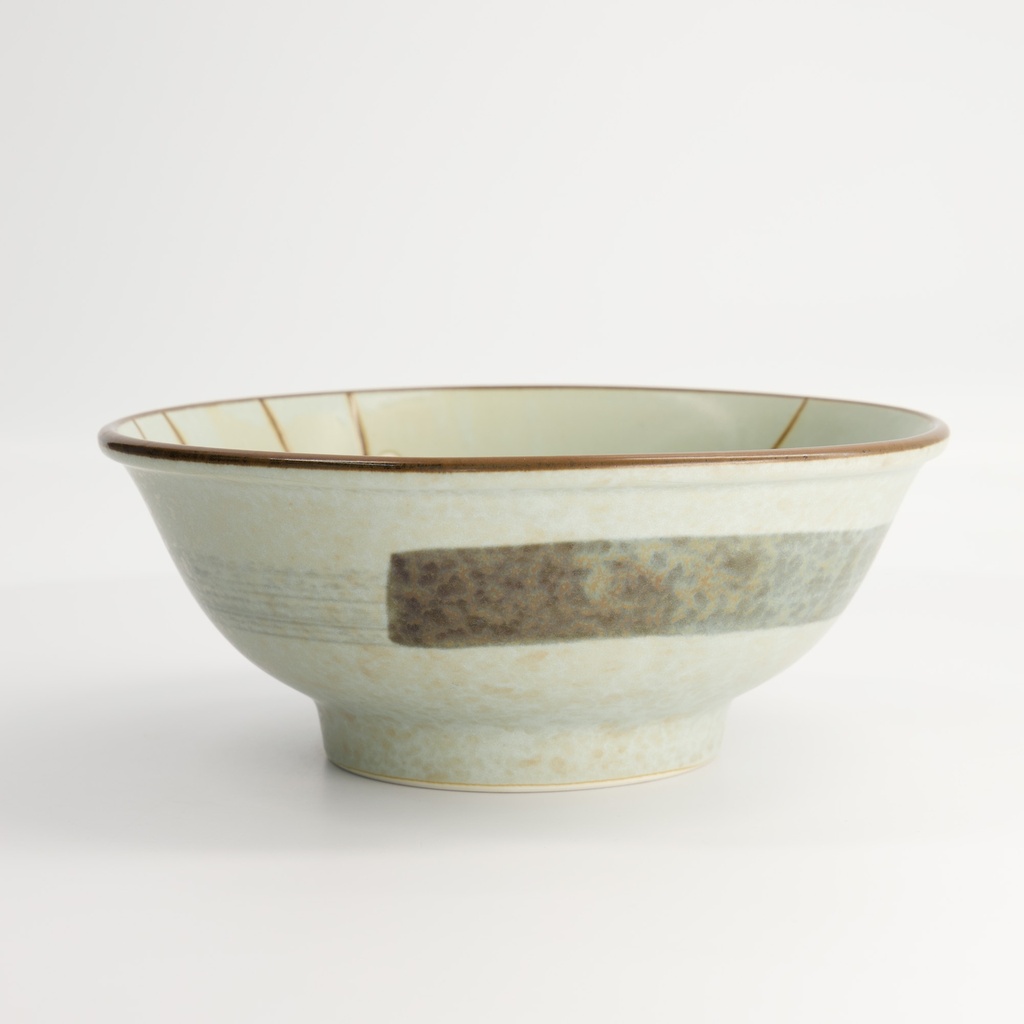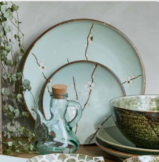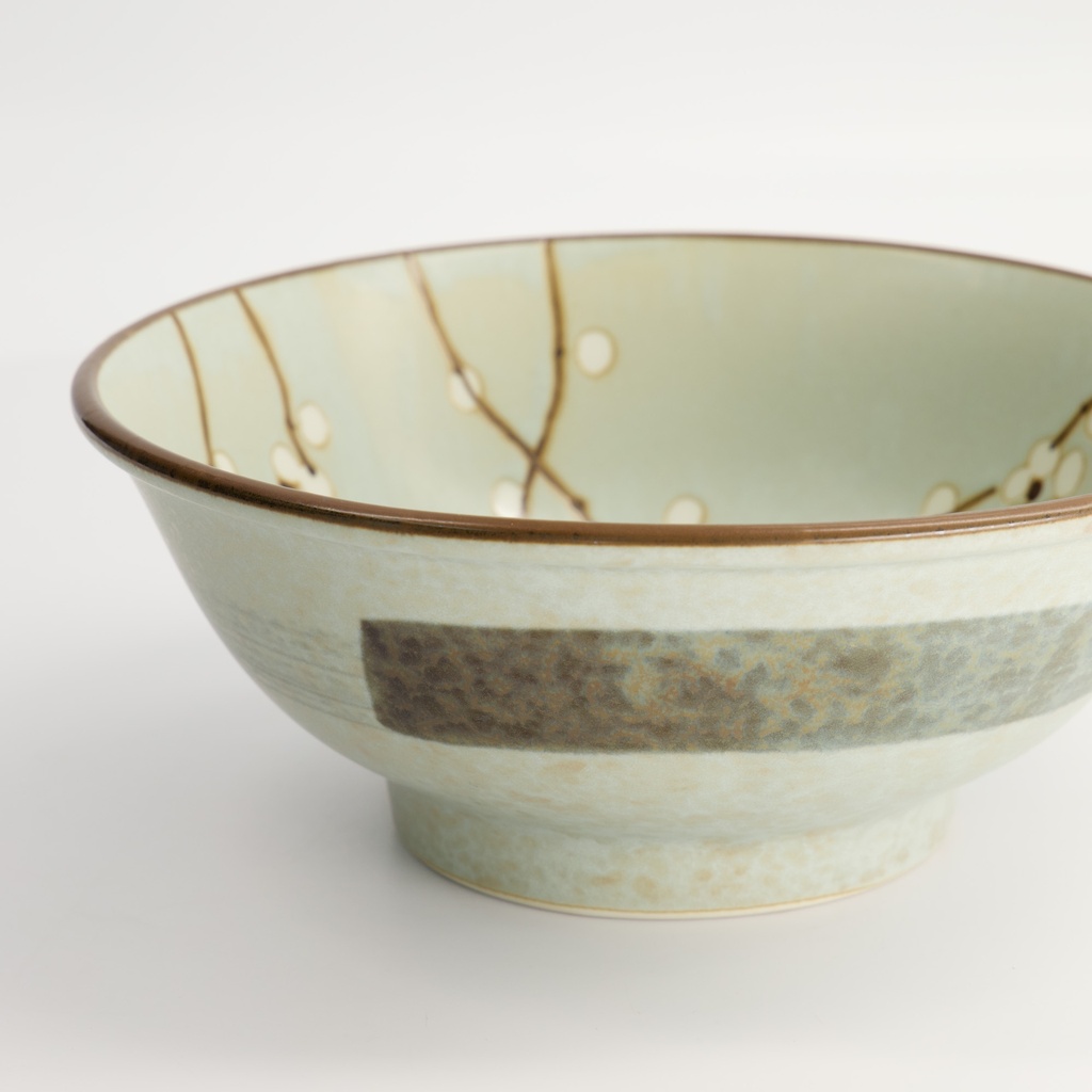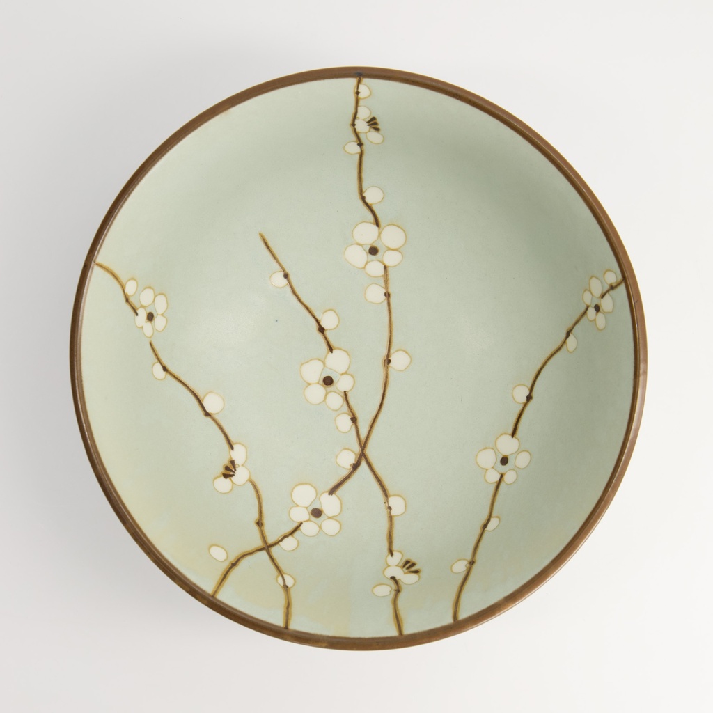Bol à liseré marron au décor de fleurs de cerisier sur fond vert pâle.