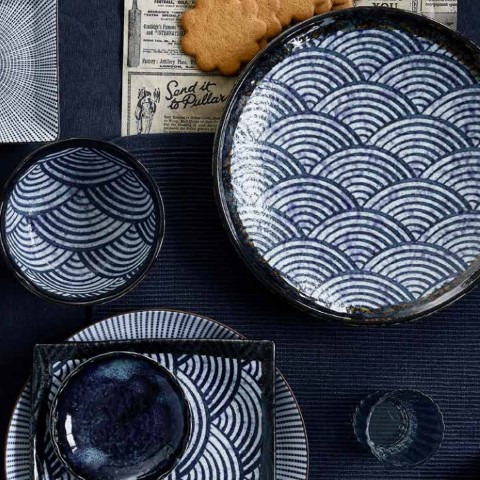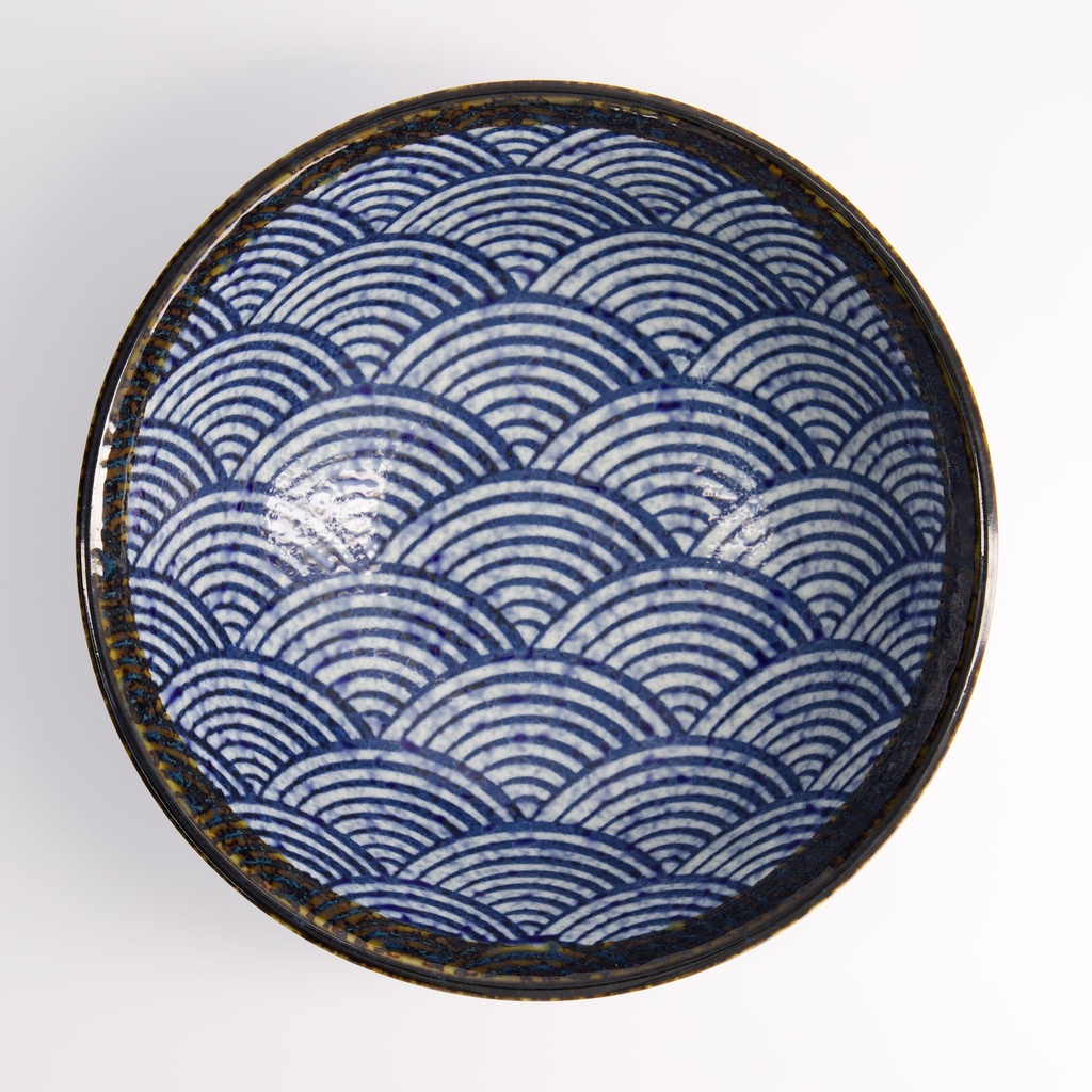 Bol ou saladier au décor de vaguelettes bleues, liseré marron.