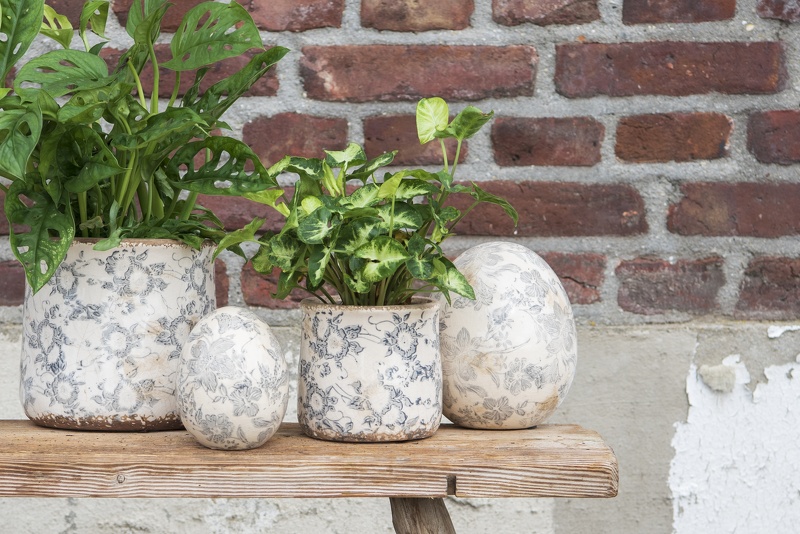 Cache-pot au décor intemporel de fleurs grises sur fond crème..