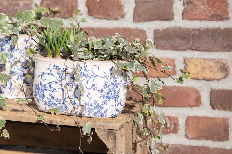Cache-pot ovale au décor de feuillage et fleurs bleues sur fond crème effet « coquille d’oeuf ».