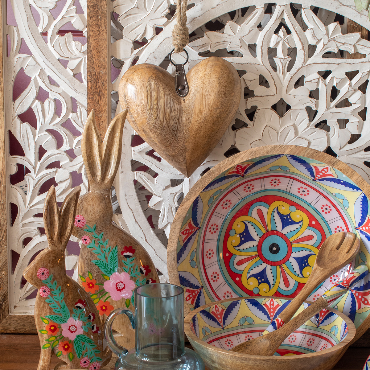 Suspension avec cœur en bois massif de manguier, suspendu par une cordelette.