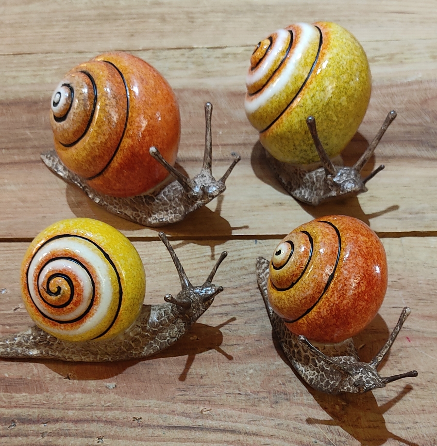 Escargot en résine, coquille de couleur jaune.