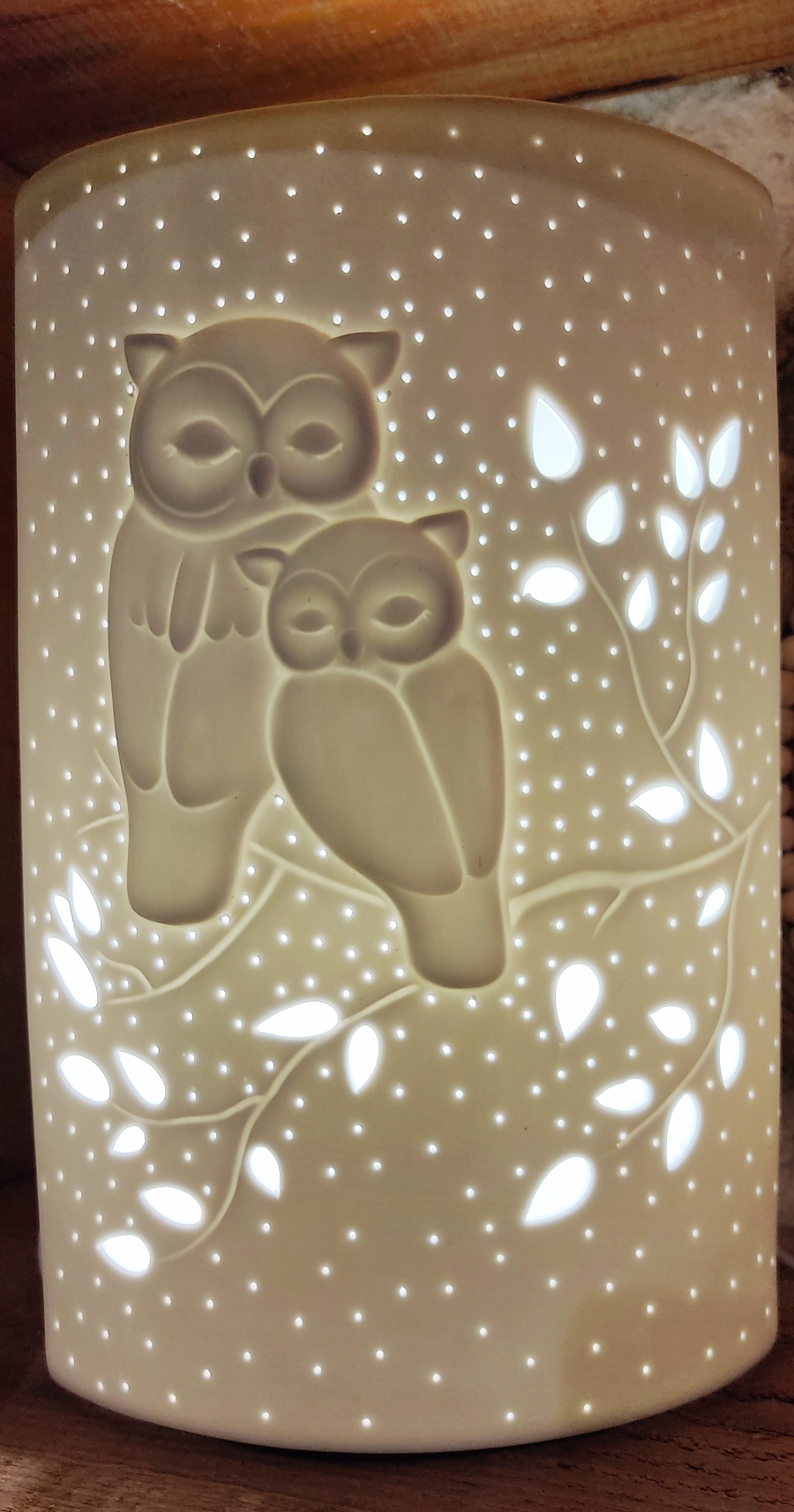 Lampe en porcelaine blanche à décor de hiboux et feuillage