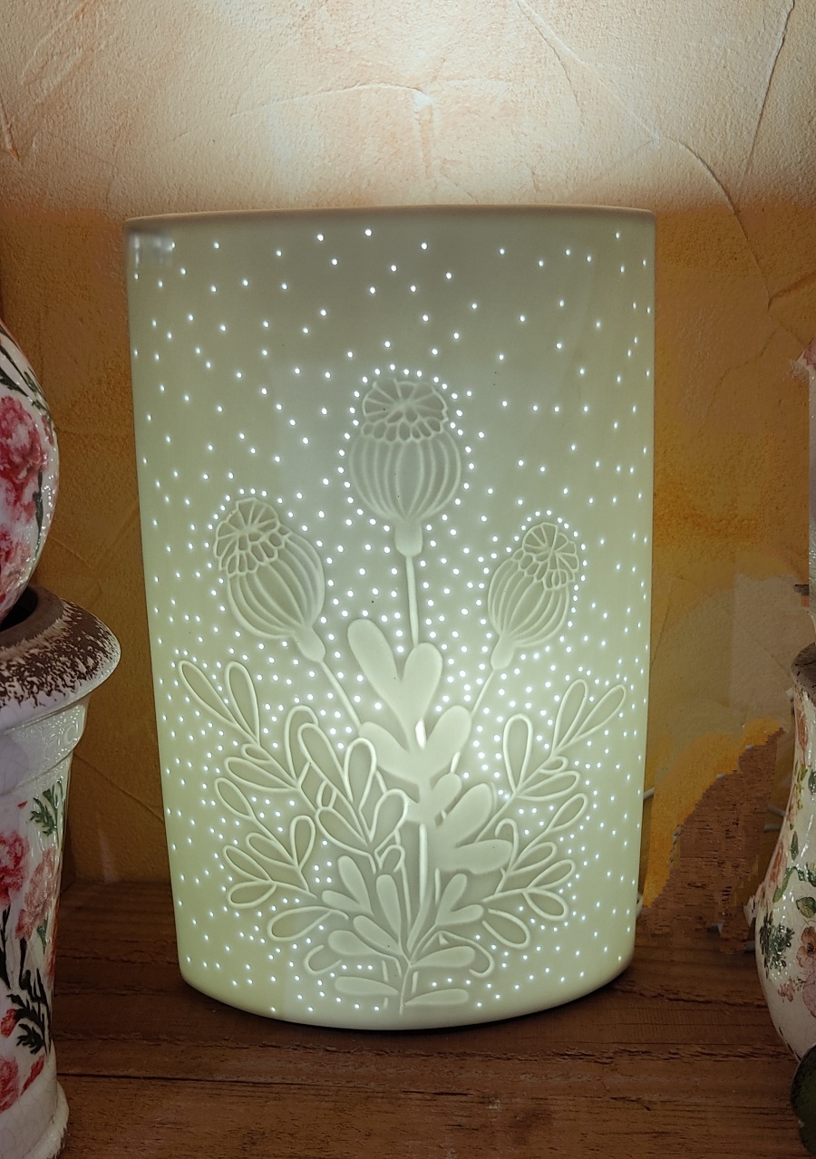 Lampe en porcelaine blanche ovale à décor de fleurs de pavot