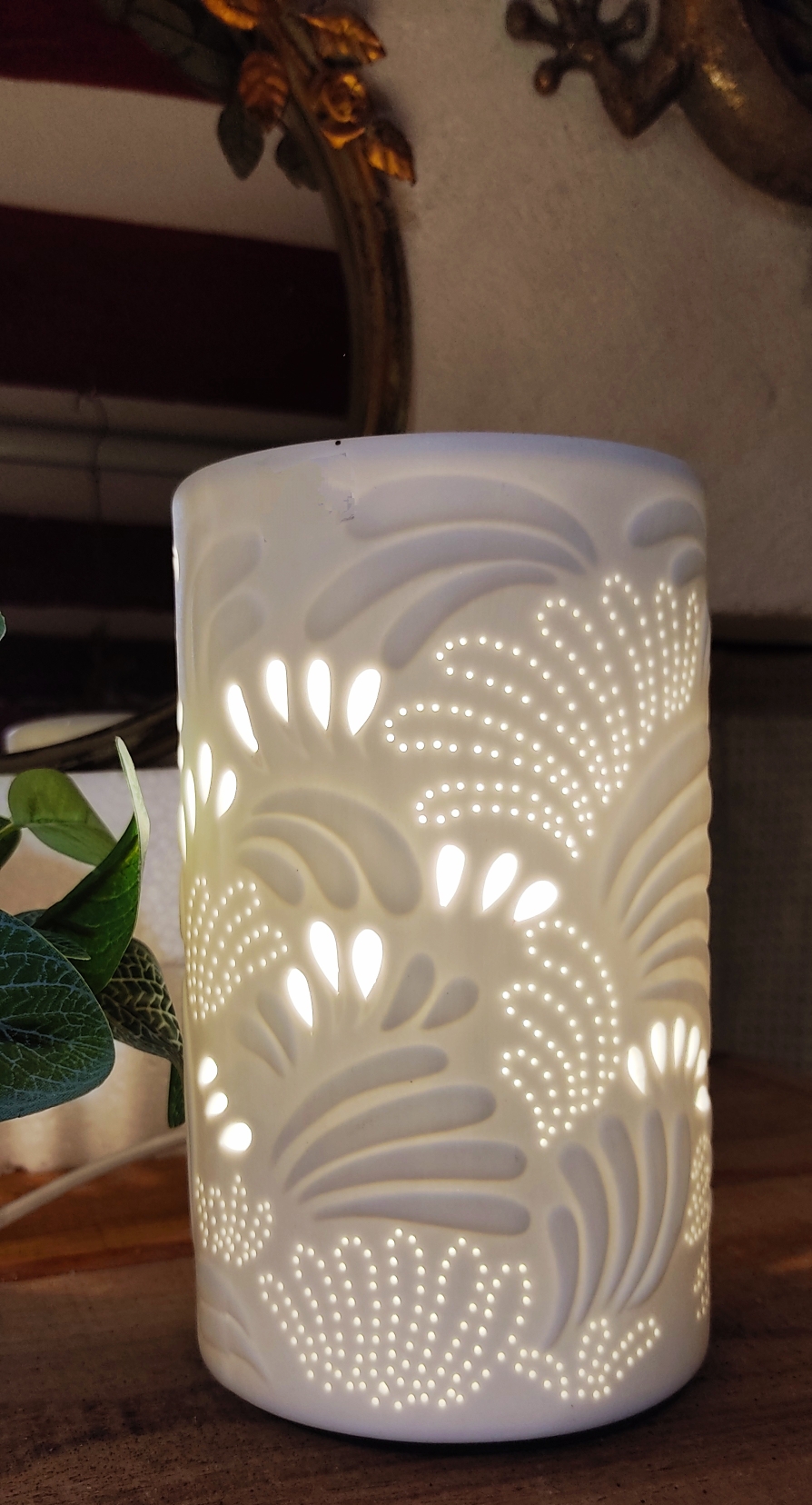 Lampe en porcelaine blanche cylindrique à décors de feuillages entrelacés.