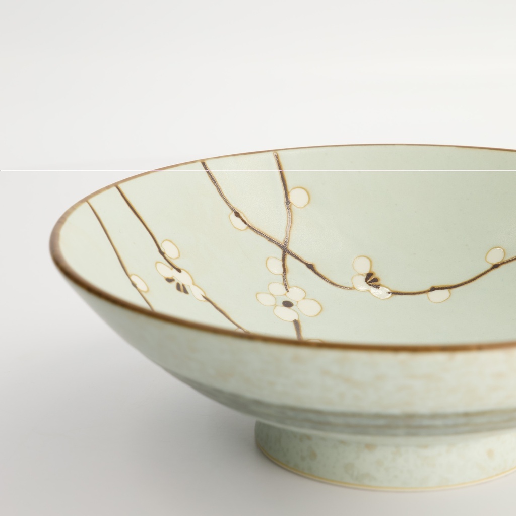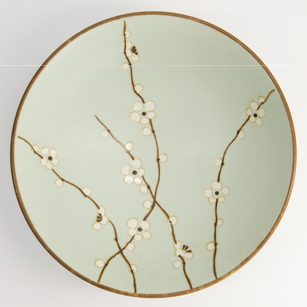 Grand saladier sur pied, vert clair au décor de fleurs de cerisier, liseré marron.
