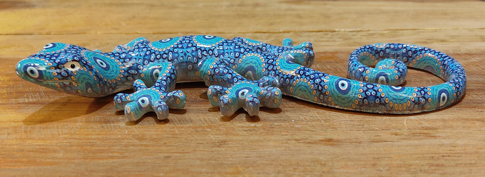 Salamandre en résine à décor géométrique, tête orientée à droite. A suspendre à l’extérieur ou à l’intérieur, la couleur ne bouge pas, ne craint pas le gel.