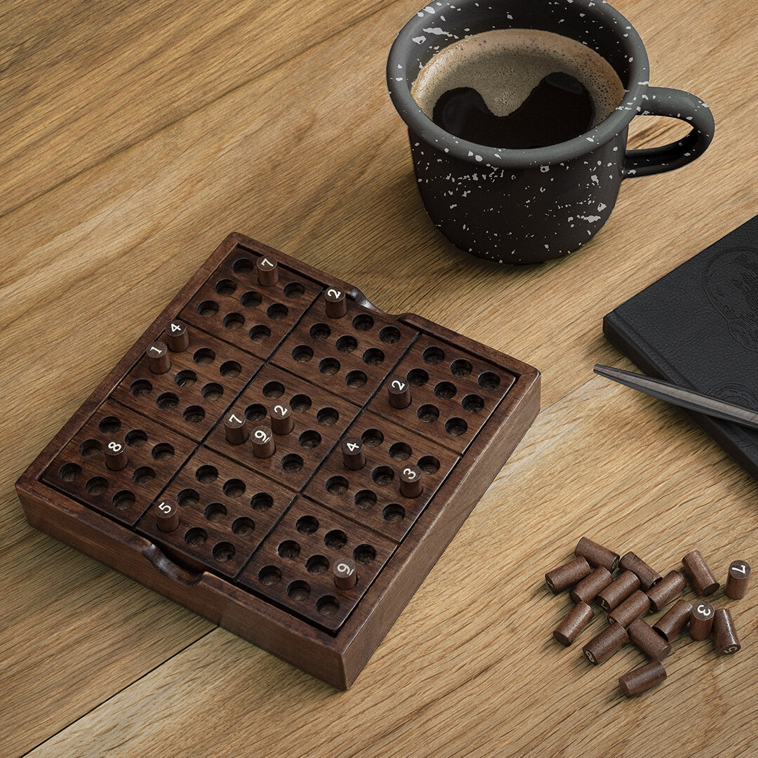 Coffret luxueux en bois d’un jeux de Sudoku, dispose de grilles de différents niveaux de difficulté, pièces en bois numérotées de 1 à 9.
